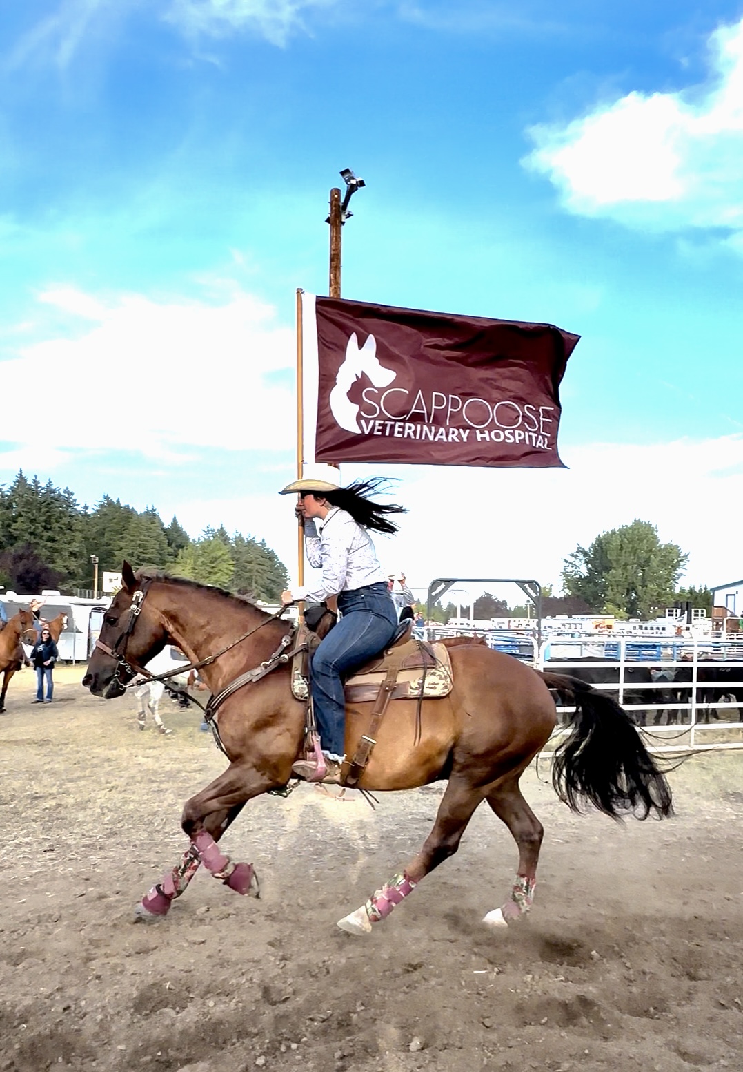 Pictured Above: Our technician Kallie riding her horse, Naughty, in the rodeo.